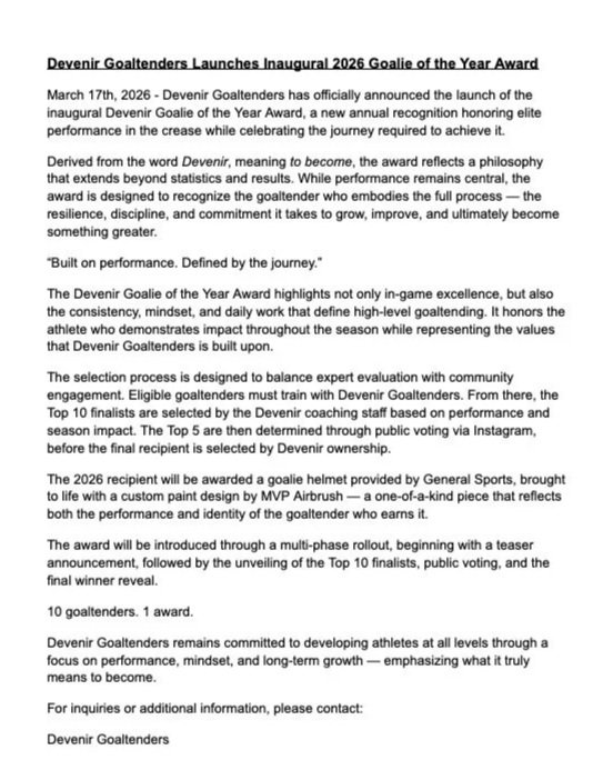 Devenir Goaltenders Launches Inaugural 2026 Goalie of the Year Award